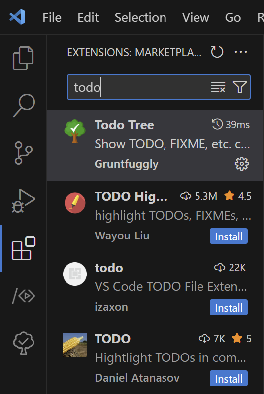 ✅ VS code의 확장자(EXTENSIONS)에 들어가서 Todo Tree를 설치(Install)한다.